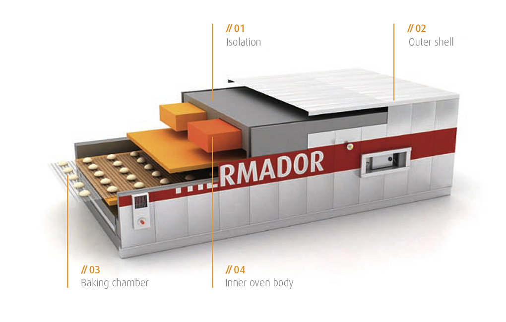 Premium quality in the baking process according to the requirements of each product requires individual temperature, heat transfer and humidity profiles. The WP solution for perfect baking results with optimised energy use is called: THERMADOR. The reliable tunnel oven for continuous production of the entire product range combines modern baking technology and high economic efficiency with reliability and durability.