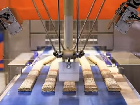 Der DELTA CUTTING ROBOT von WP LAMINATING setzt eine neue Technologie ein, um die Gewichtsgenauigkeit deutlich zu verbessern. Die einzelnen Teigstränge fahren durch einen Laserstrahl. Zwei Kameras scannen die Geometrie des Teigstrangs auf Unebenheiten, die Steuerung wertet die Ergebnisse in Sekundenbruchteilen aus. Der nachfolgende Schneideroboter bekommt von der Steuerung die Information, wo er den exakten Schnitt setzen muss, damit gewichtsgleiche Teigstücke entstehen. Dafür springt der Roboter zwischen den Teigsträngen hin- und her, wenn nötig auch über die gesamte Breite.